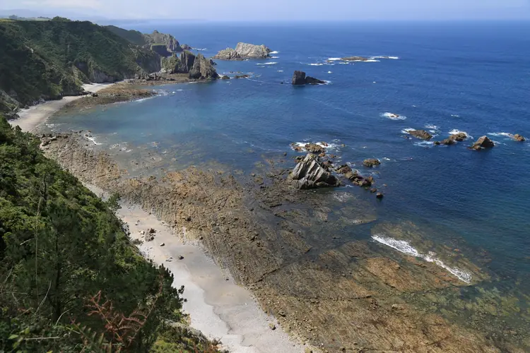 Playa de La Ribera del Molín. Siguiendo un angosto camino que parte de Castañeras se descubre el acantilado desde el cual se avista, al fondo, integrada en una relevante área de conchas, la apacible playa de La Ribera del Molín, perten ...