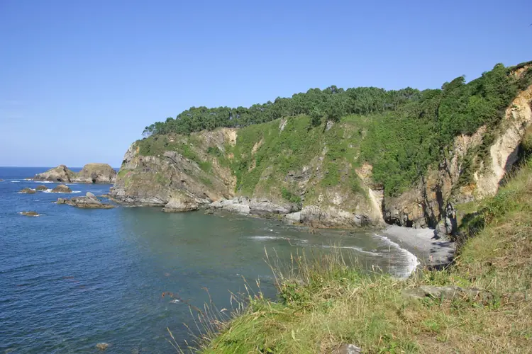 Playa de La Cueva. Al oeste del Cabo Vidio, una vez recorrido un benigno camino modelado en forma de zigzag sobre el acantilado —de marcada cuesta— que la guarece, se extiende la playa de La Cueva, que viene a ser prácticamente una p ...