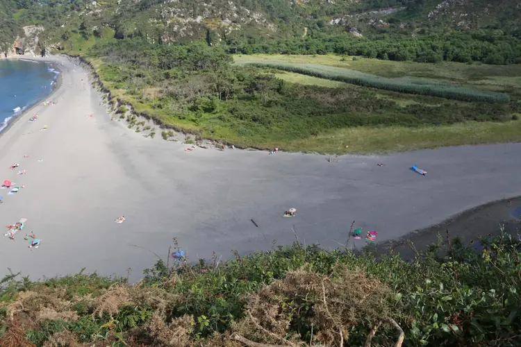 Playa de La Figueira. Si la playa de A Figueira —que apenas se deja ver durante la pleamar— convoca a un número algo más elevado de gente que las anteriores, cabe pensar en atribuirlo a su cómodo acceso desde la aldea de Me ...